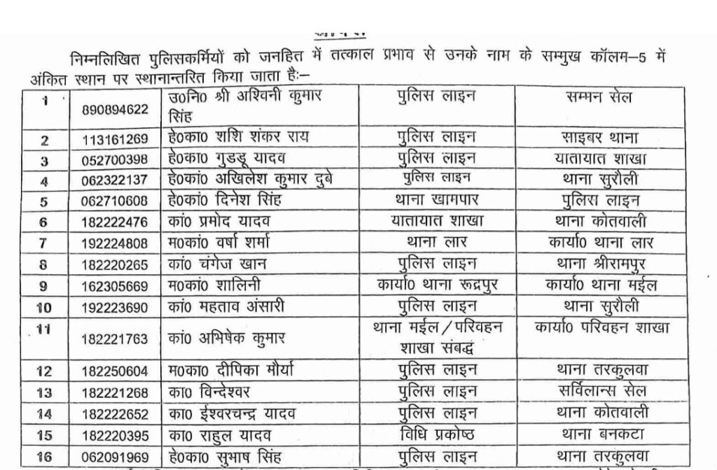 तबादला सूची के अनुसार उपनिरीक्षक अश्वनी कुमार को पुलिस लाइन से सम्भल सैल भेजा गया है। हेड कांस्टेबल शशि शंकर राय को पुलिस लाइन से साइबर थाना में तैनात किया गया है। हेड कांस्टेबल गुडडू यादव को यातायात पुलिस में तैनात किया गया है। हेड कांस्टेबल अखिलेश कुमार दूबे को पुलिस लाइन से थाना सुरौली स्थानांतरित किया गया है। वहीं हेड कांस्टेबल दिनेश सिंह को खामपार थाने से पुलिस लाइन भेजा गया है।