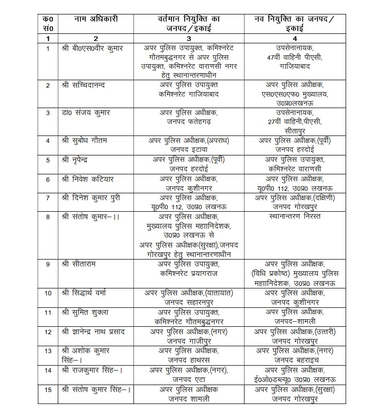 अपर पुलिस अधीक्षक फतेहगढ़ डॉ संजय कुमार को उपसेनानायक, 27वीं वाहिनी, पीएसी सीतापुर भेजा गया हैं। इटावा अपर पुलिस अधीक्षक अपराध सुबोध गौतम को अपर पुलिस अधीक्षक पूर्वी हरदोई बनाया गया हैं।