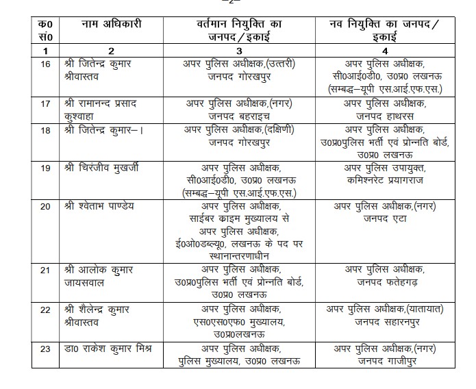 पुलिस विभाग में बड़ा फेरबदल करते हुए 23 एडिशनल एसपी के तबादले कर दिए। बी एस वीर कुमार अपर पुलिस उपायुक्त को कमिश्नरेट गौतमबुद्धनगर से अपर पुलिस उपायुक्त कमिश्नरेट वाराणसी बनाया गया हैं। डॉ संजय कुमार को उपसेनानायक, 27वीं वाहिनी, पीएसी सीतापुर भेजा गया हैं।