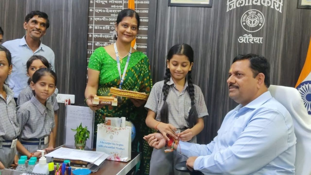 औरैया में रक्षाबंधन के अवसर पर स्कूली छात्राओं ने जिलाधिकारी डॉ. इंद्रमणि त्रिपाठी को तिलक लगाकर राखी बांधी। छात्राओं ने उन्हें मिठाई खिलाकर मुंह मीठा भी कराया।