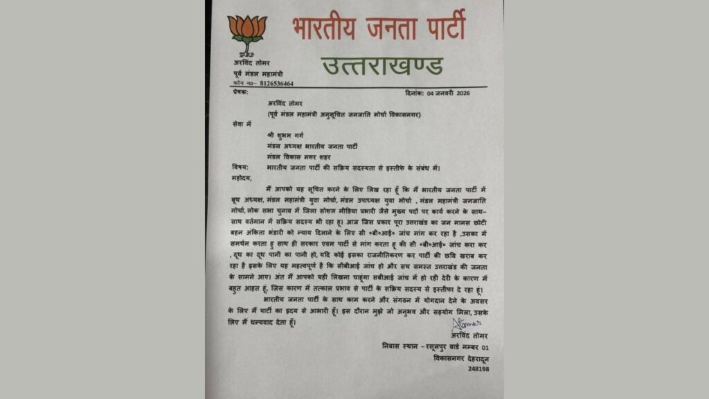 Dehradun: उत्तराखंड के बहुचर्चित अंकिता भंडारी हत्याकांड को लेकर अब भारतीय जनता पार्टी की मुश्किलें बढ़ती नजर आ रही हैं। जहां एक ओर विपक्ष लगातार सरकार को घेर रहा है, वहीं अब खुद बीजेपी के नेता भी पार्टी के फैसलों से असंतोष जताते हुए CBI जांच की मांग कर रहे हैं। इसी क्रम में विकासनगर क्षेत्र से भाजपा नेता अरविंद सिंह तोमर ने पार्टी की सक्रिय सदस्यता से इस्तीफा दे दिया है।