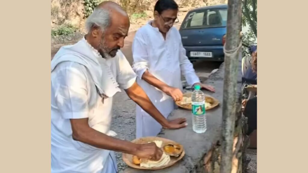 सुपरस्टार रजनीकांत ने फिलहाल फिल्मों से ब्रेक ले लिया है। वे चकाचौंध से दूर आध्यात्मिक यात्रा पर हैं। कल रविवार को रजनीकांत को सादगीभरे अंदाज में सड़क किनारे पत्तल पर खाना खाते देखा गया। साधारण कपड़ों में वे अपने एक परिचित के साथ पत्तल पर खाने का लुत्फ उठाने नजर आए।