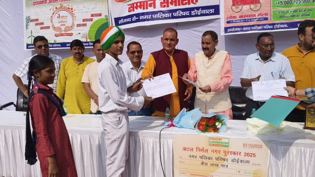 Dehradun: शहरी विकास विभाग द्वारा कराए गए स्वच्छता सर्वेक्षण 2025 में डोईवाला नगर पालिका को देशभर में द्वितीय स्थान प्राप्त हुआ है। इस गौरवपूर्ण उपलब्धि पर राज्य के मुख्यमंत्री पुष्कर सिंह धामी ने बीते बुधवार को नगर पालिका को अटल निर्मल नगर पुरस्कार से सम्मानित किया। यह उपलब्धि स्वच्छता के प्रति नगर पालिका की दूरदर्शिता, योजनाबद्ध कार्य प्रणाली और नगरवासियों की सहभागिता का नतीजा है।