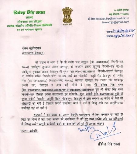 डीजीपी को दिए पत्र के अनुसार त्रिवेंद्र सिंह रावत ने पुरोला निवासी अंकित रावत पर देहरादून निवासियों से 50 करोड़ की ठगी करने का आरोप लगाया है। त्रिवेंद्र सिंह रावत का पत्र वायरल होने के बाद सियासी घमासान मच गया।