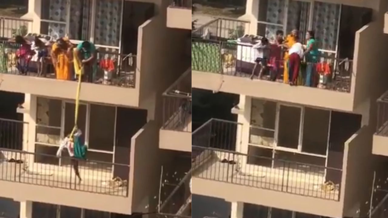 इसके बाद महिला ने बच्चा को अपनी बालकनी की रेलिंग से नीचे की ओर लटका दिया। बच्चा बहुत डरा हुआ और संभलकर नीचे बढ़ रहा था। नीचे पहुंचकर उसने साड़ी उठाई और फिर मां ने उसे ऊपर खींच लिया। इस पूरी प्रक्रिया के दौरान न तो बच्चे के पास कोई सुरक्षा बेल्ट थी और न ही कोई अन्य सुरक्षा इंतजाम।