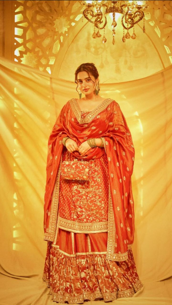 रस्ट ऑरेंज हैंडवर्क सूट में घेरदार स्कर्ट और हैवी दुपट्टा रॉयल फील देता है।