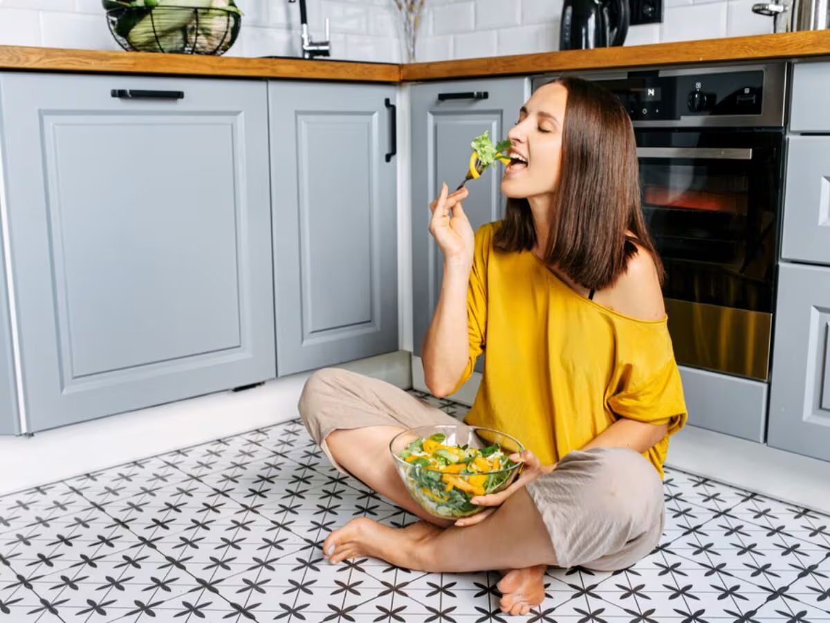 भोजन करते समय जमीन पर बैठने से ध्यान खाने पर केंद्रित होता है।