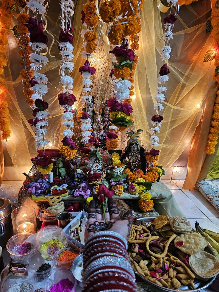 पूजन में नीम की पत्तियाँ, मिट्टी की वेदी, फल, फूल, पकवान और